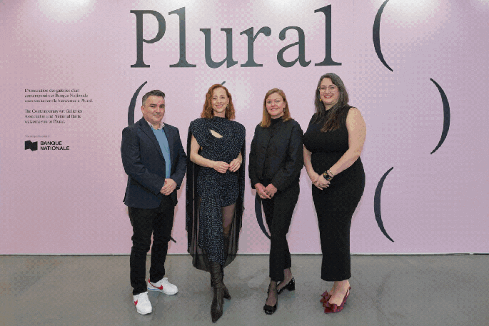 Première photo : Andrés Durán, président du C.A. de l’AGAC ; Karine Vanasse, porte-parole de la foire Plural ; Jo-Ann Kane, Conservatrice de la Collection Banque Nationale ; Anie Deslauriers, directrice de l’AGAC. / photo : Vivien Gaumand